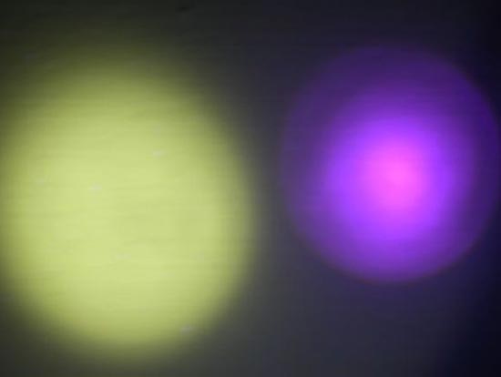 下圖左邊是365nm紫外線手電照到無熒光的白色物體上的顏色,右邊是395nm的紫外線手電效果。