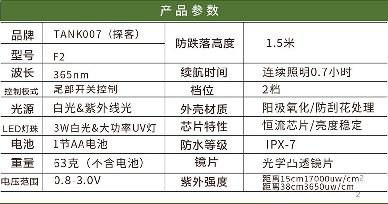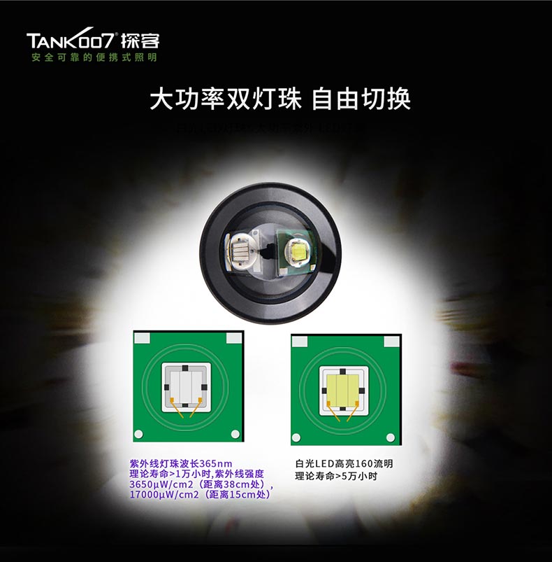 TANK007探客F2多功能雙光調(diào)焦手電筒&紫外線手電手電筒:一款兼具日用照明和熒光檢測的便攜式調(diào)焦手電筒,即可聚光實現(xiàn)較遠(yuǎn)距離應(yīng)用,也可泛光滿足近距離較大范圍應(yīng)用