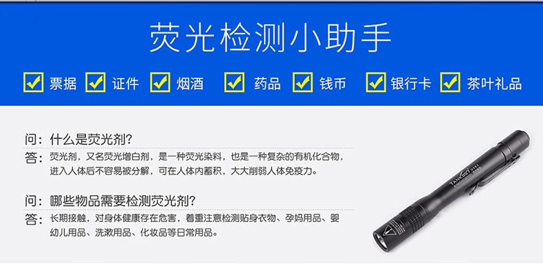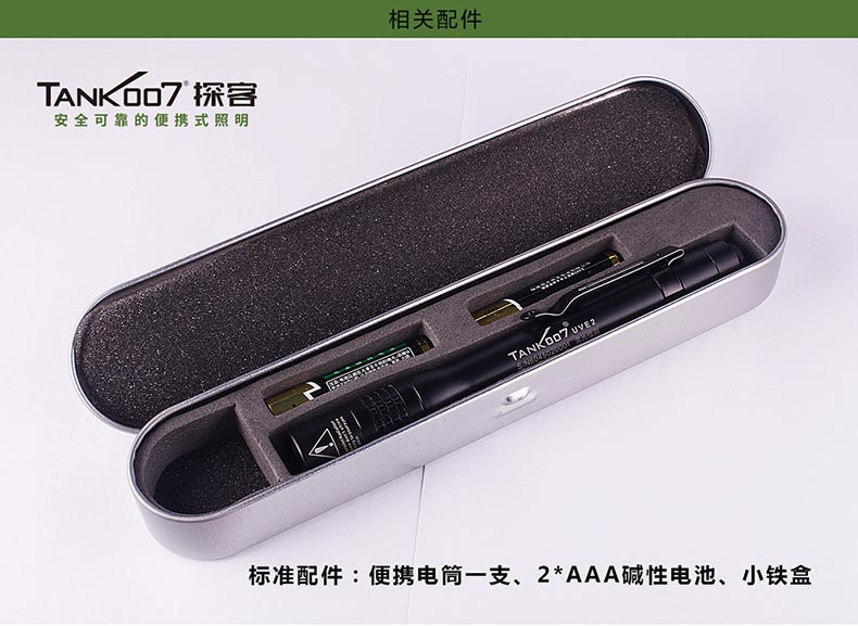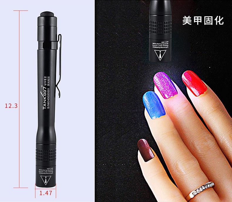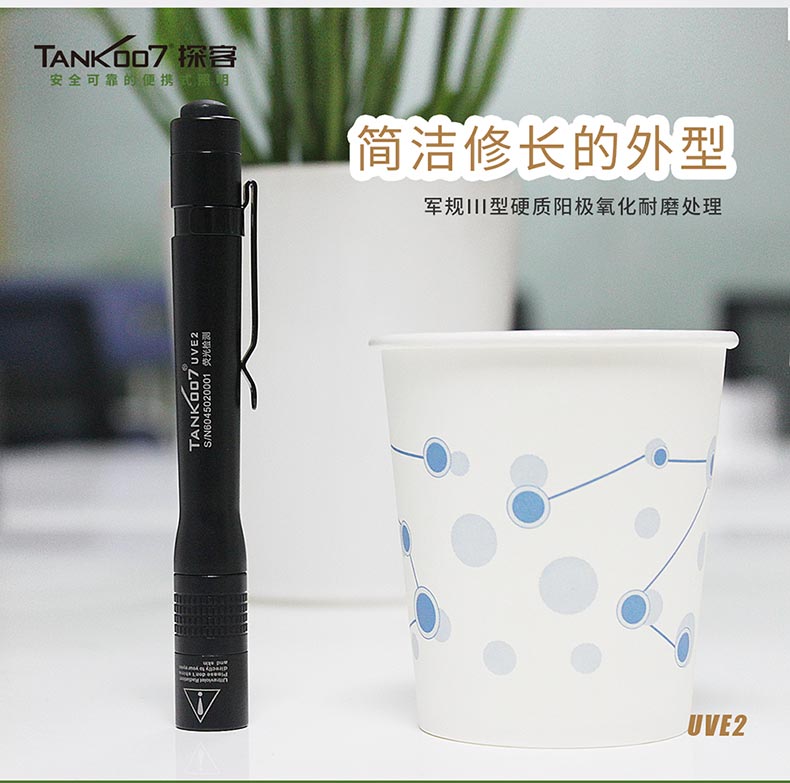 TANK007探客UVE2便攜式迷你365nm紫光手電筒1.UVE2是一款便攜式迷你筆帽式熒光檢測手電筒,使用兩節(jié)AAA電池2.筆夾設(shè)計,方便攜帶