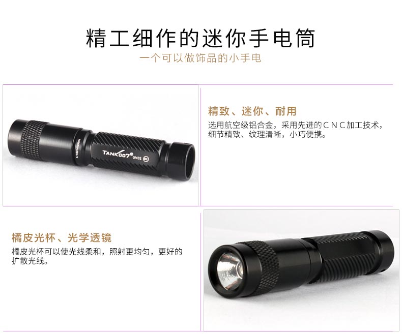 TANK007探客UV01熒光劑檢測365nm紫外線手電筒:1.UV01是一款便攜式迷你日用UV手電筒,使用一節AAA電池2.配合鑰匙扣可以方便掛于鑰匙串上隨身攜帶