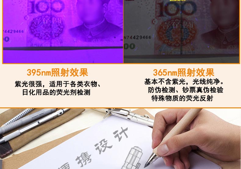 1. UV02是一款便攜式迷你筆帽式UV紫光手電筒,使用兩節(jié)AAA電池。雙向抱夾及筒身滴水紋設(shè)計(jì),不僅方便攜帶也美觀大方。