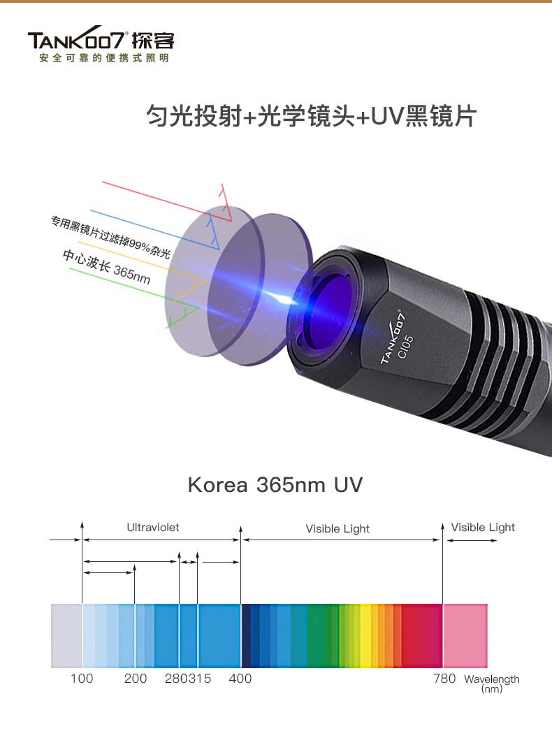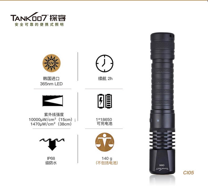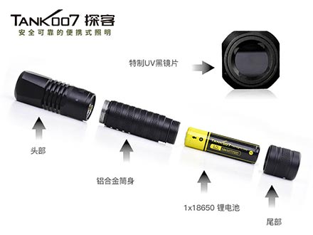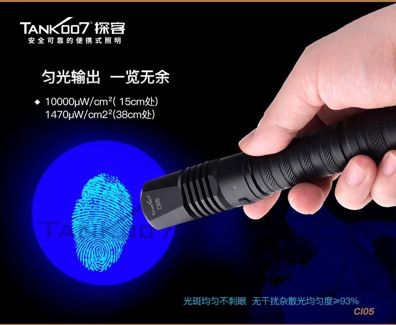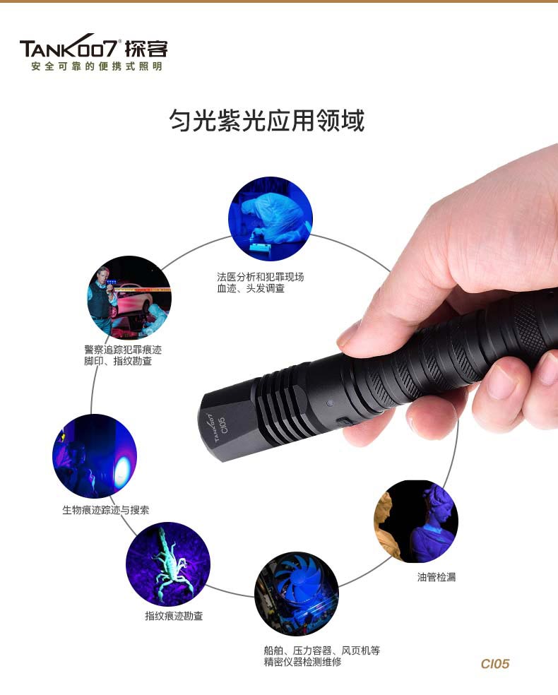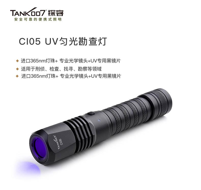 TANK007探客CI05 UV勻光勘查燈,刑偵、檢查、勘查365nm紫外線手電筒,是一款專業刑偵檢測、痕跡檢驗、工業探傷、檢漏紫外線勻光手電筒,也適用于警察安防的驗痕、血跡,作案現場的查勘。