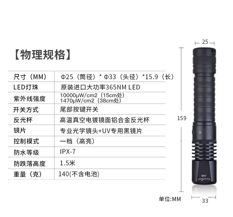 尺寸(厘米): 15.9(長度)*3.3(筒徑) 重量(克): 140 (不含電池)