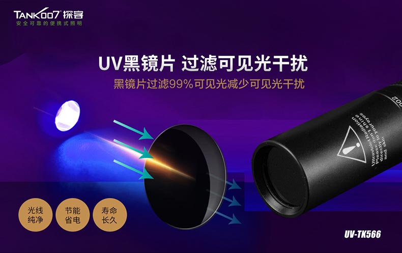 3. UV手電筒特制鏡片,有效過(guò)濾可見(jiàn)光,降低可見(jiàn)光干擾