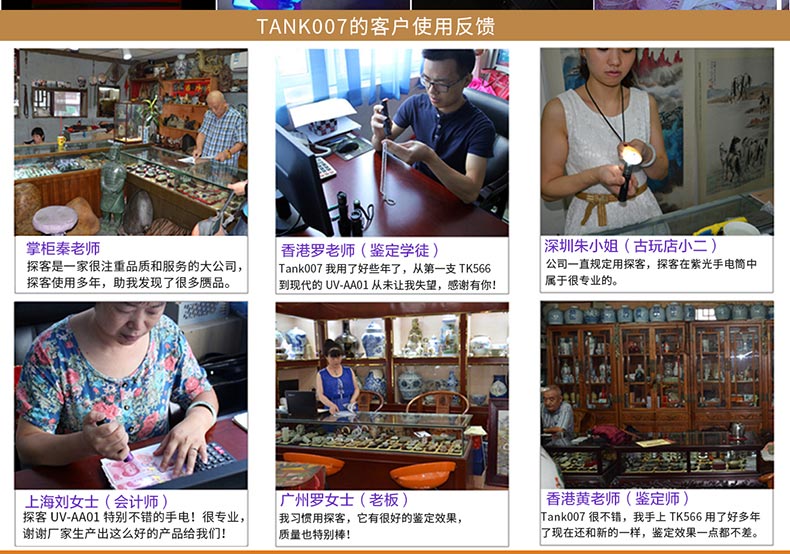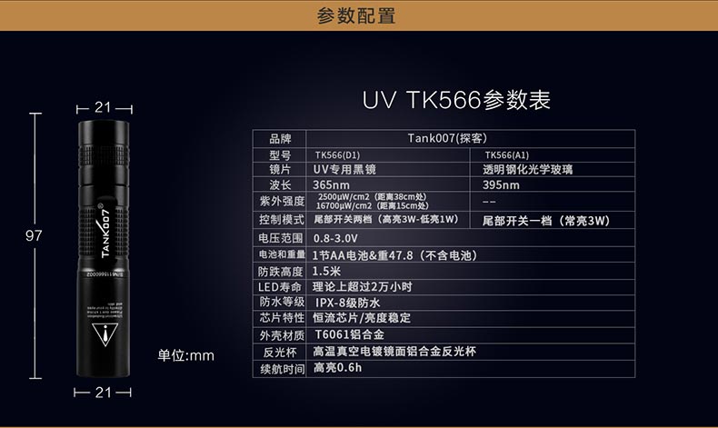 TANK007探客UV-TK566古玩鑒定/珠寶鑒賞紫外線手電筒:原裝進(jìn)口365nmLED,使用2*AA電池,UV手電筒特制鏡片,有效過(guò)濾可見(jiàn)光,降低可見(jiàn)光干擾,是一款專(zhuān)業(yè)獵奇尋寶、古董鑒定和玉石/玉...