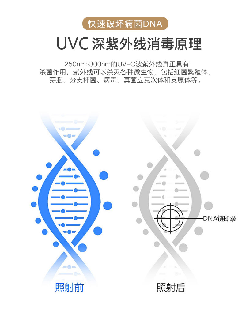 UV-C紫外線殺菌燈已不是什么新事物了,甚至在COVID-19、SARS爆發之前,紫外線燈就已經用于對生產線上的產品進行消毒,對廢水處理廠中的水進行處理以及被動清潔HVAC系統難以觸及的部分(線圈,鍋和通風口)及其他應用場景中進行了嘗試和測試。紫外線衛生燈再次聚焦在人們的眼中是因為COVID-19大流行期間被廣泛使用。暴露的空氣和水中都存在大量細菌,使用紫外線殺菌燈長時間的照射,能將空氣中或水中的各種微生物去除掉,其原理是深紫外線能夠破壞細胞膜和細胞核結構尤其是破壞遺傳物質DNA/RNA的堿基對,使其失去復制能力或失去活性而死亡。