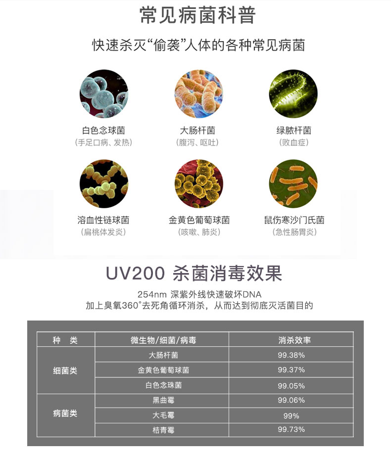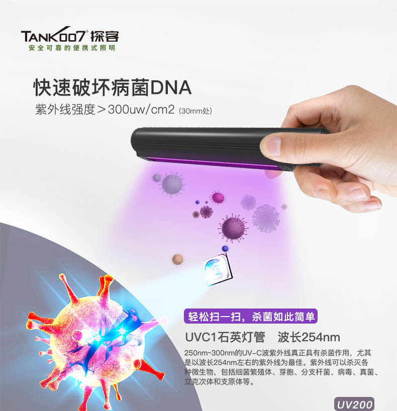 紫外線手電筒波長在250nm~300nm的UV-C紫外線可有效殺滅常見的細菌繁殖體、芽孢、大腸桿菌、病毒(SARS、COVID-19)、真菌、立克次體和支原體等各類病菌。